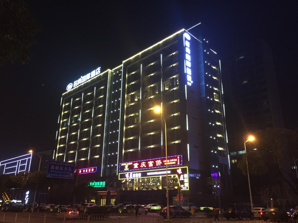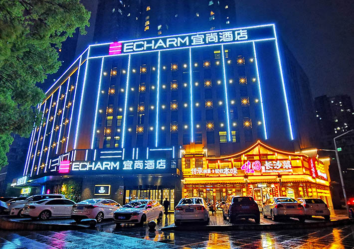 長沙酒店亮化 戶外亮化設(shè)計 LED夜景亮化安裝及施工工程采用IP 65防護等級的LED線條燈,十字星光燈搭配設(shè)計。燈具色溫采用冷、暖色搭配設(shè)計,主線條燈勾勒出建筑亮化的輪廓,采用暖色星光燈營造長沙酒店亮化的溫馨氛圍。